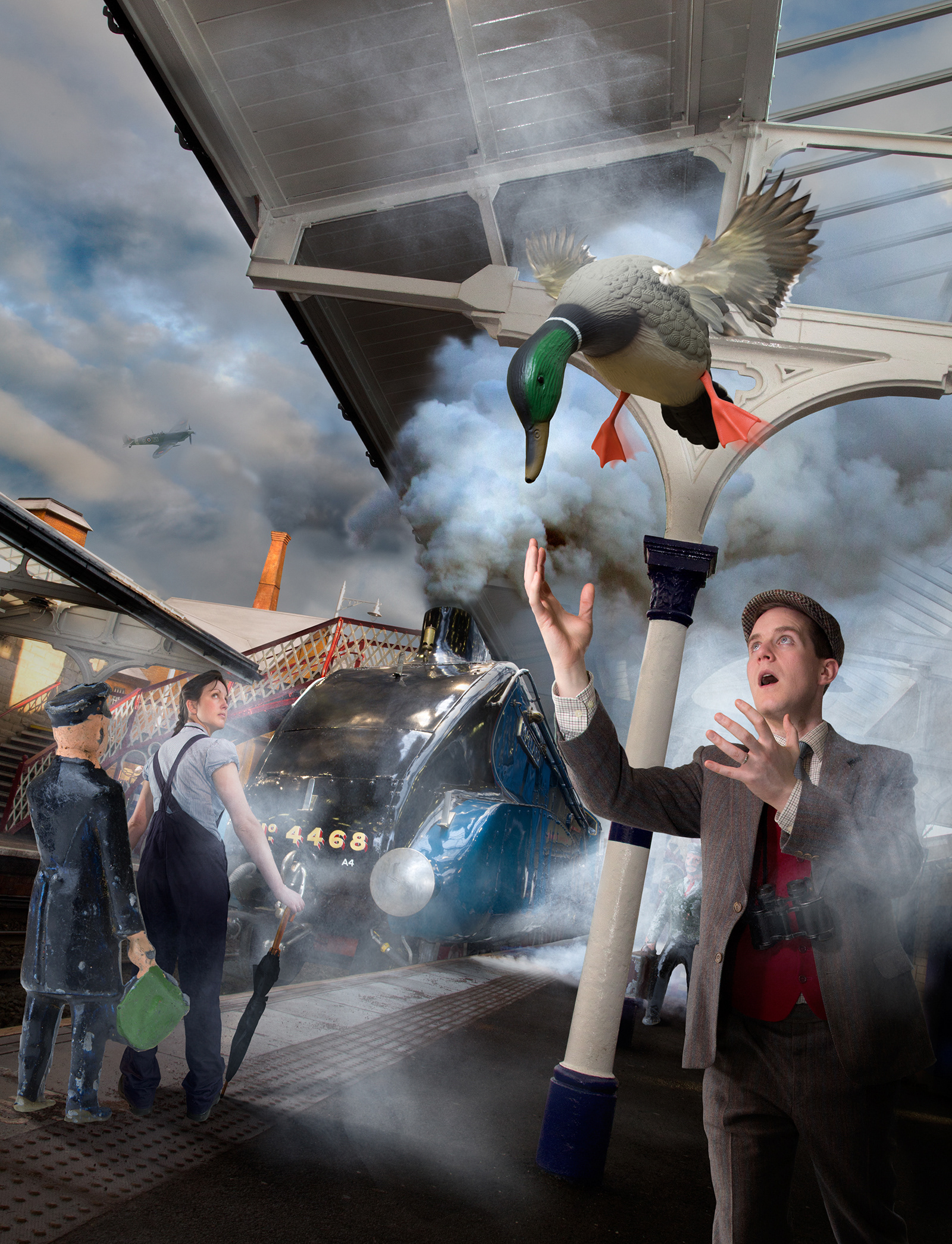STEAMSONG: A commission to make a seminal image to represent the contemporary opera STEAMSONG composed by John Kefala Kerr. The world record holding Mallard train featured here was photographed in York, and the actors are two of the cast. There were dark elements in the opera and this is reflected in my treatment - combining the 'real' and the fabricated to make a highly constructed image.
