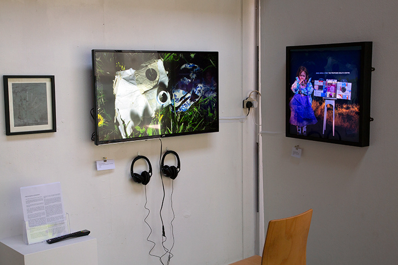 Working together and in tandem, we offer a variety of perspectives, from the tangle of grass and detritus that is currently Caroline street. The piece comprises 7 A0 posters pasted onto board, video, audio conversation, photo based floor piece, red light bulb, light box, found frames with wall mounted images.